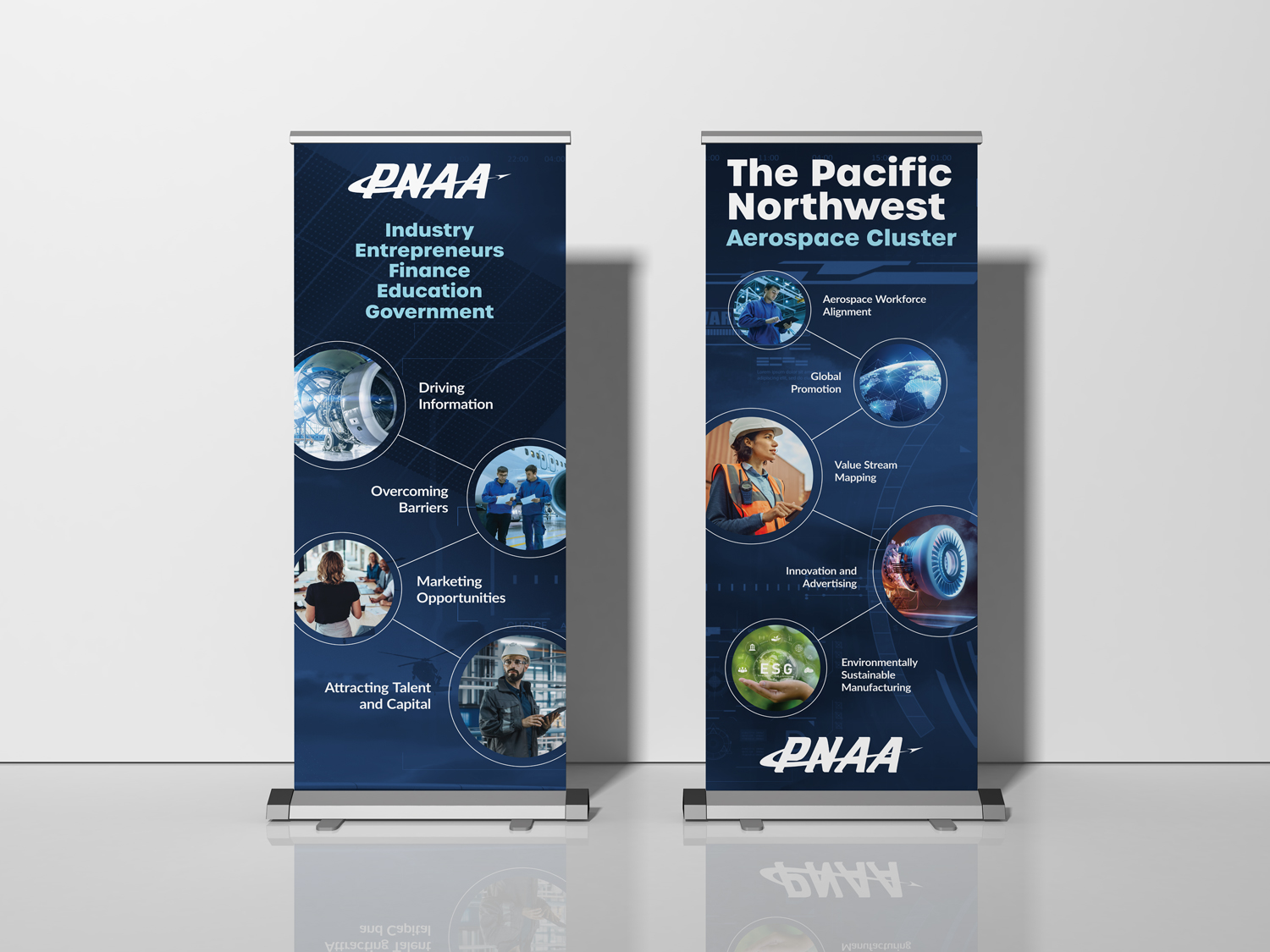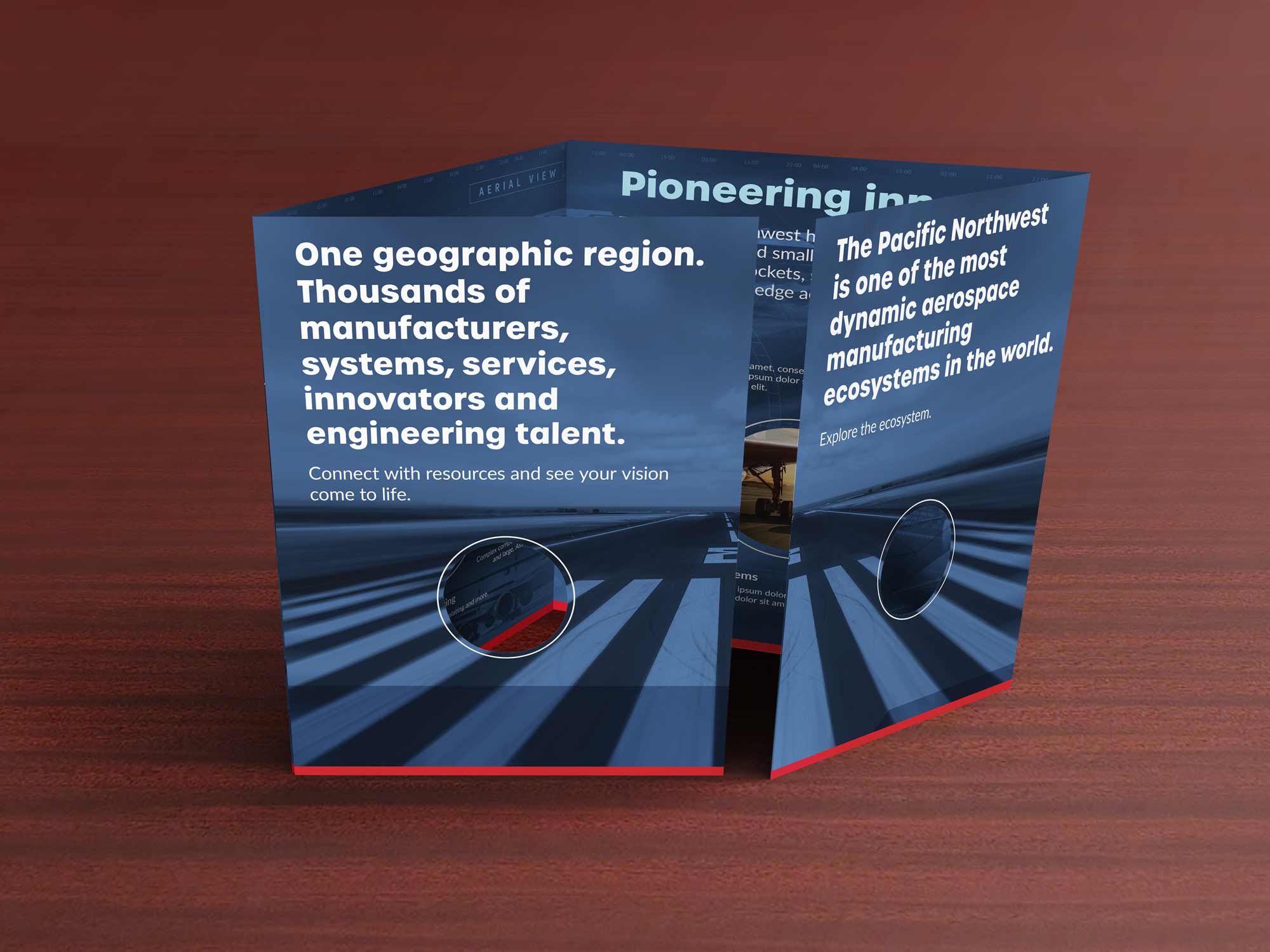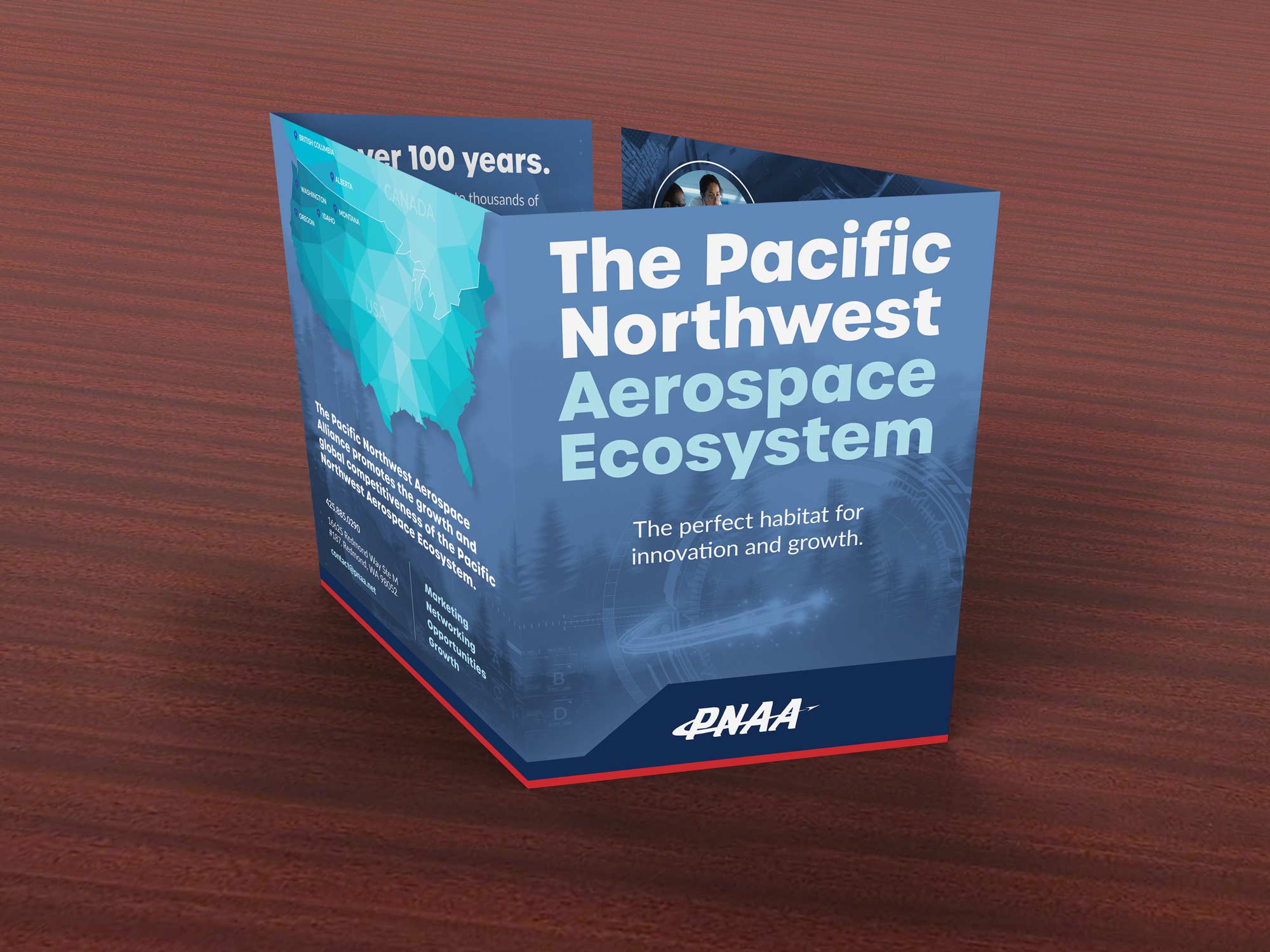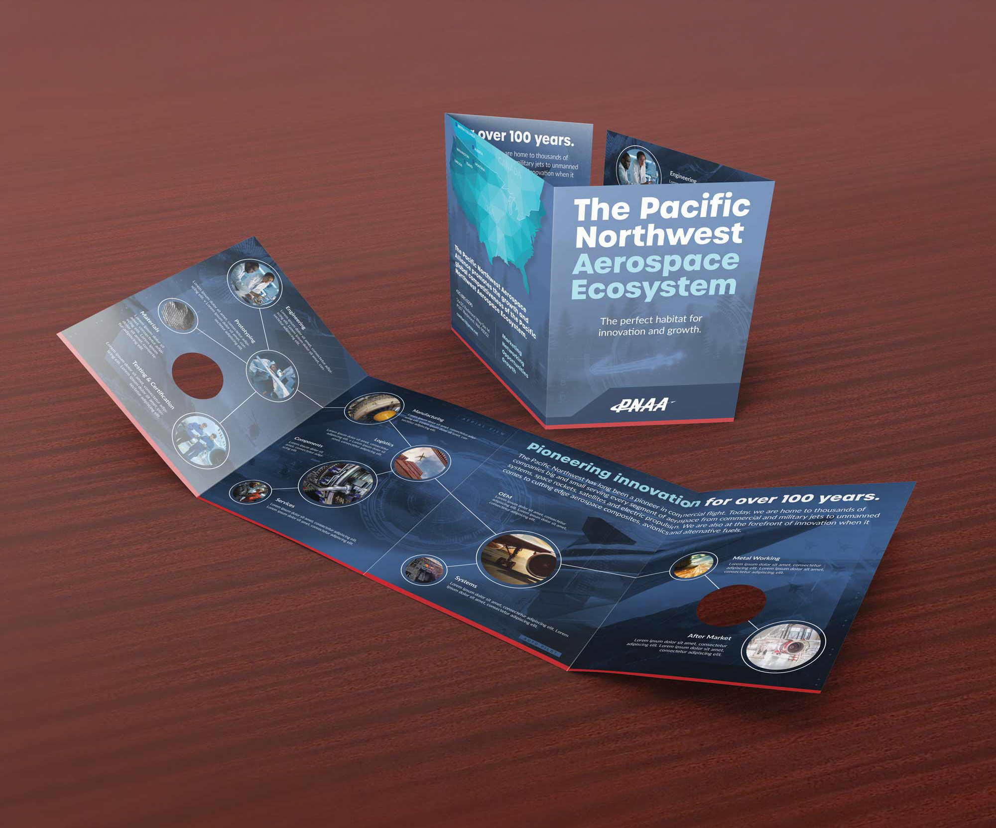 This project features a set of trade show materials created for the Pacific Northwest Aerospace Alliance to strengthen the organization’s presence at industry events. A custom die-cut brochure was designed to capture attention while clearly presenting the association’s mission, programs, and member benefits in a distinctive, memorable format.